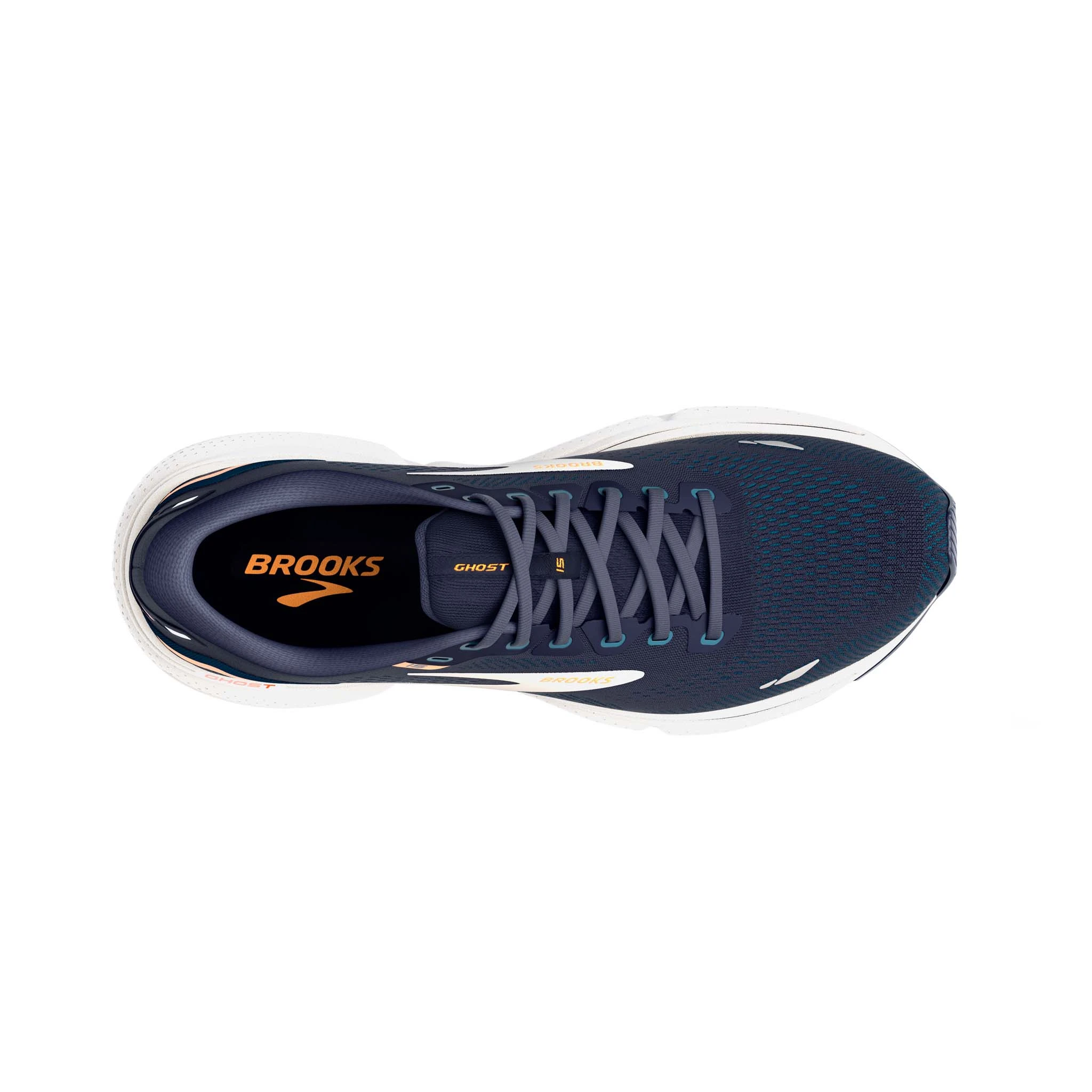 Advice for Road Runners: The Brooks Men’s Ghost 15 2E Running Shoes in the Peacoat/Blue/Orange Pop colourway offer a wider fit and have been updated with a lighter midsole to deliver a soft smooth underfoot feel.