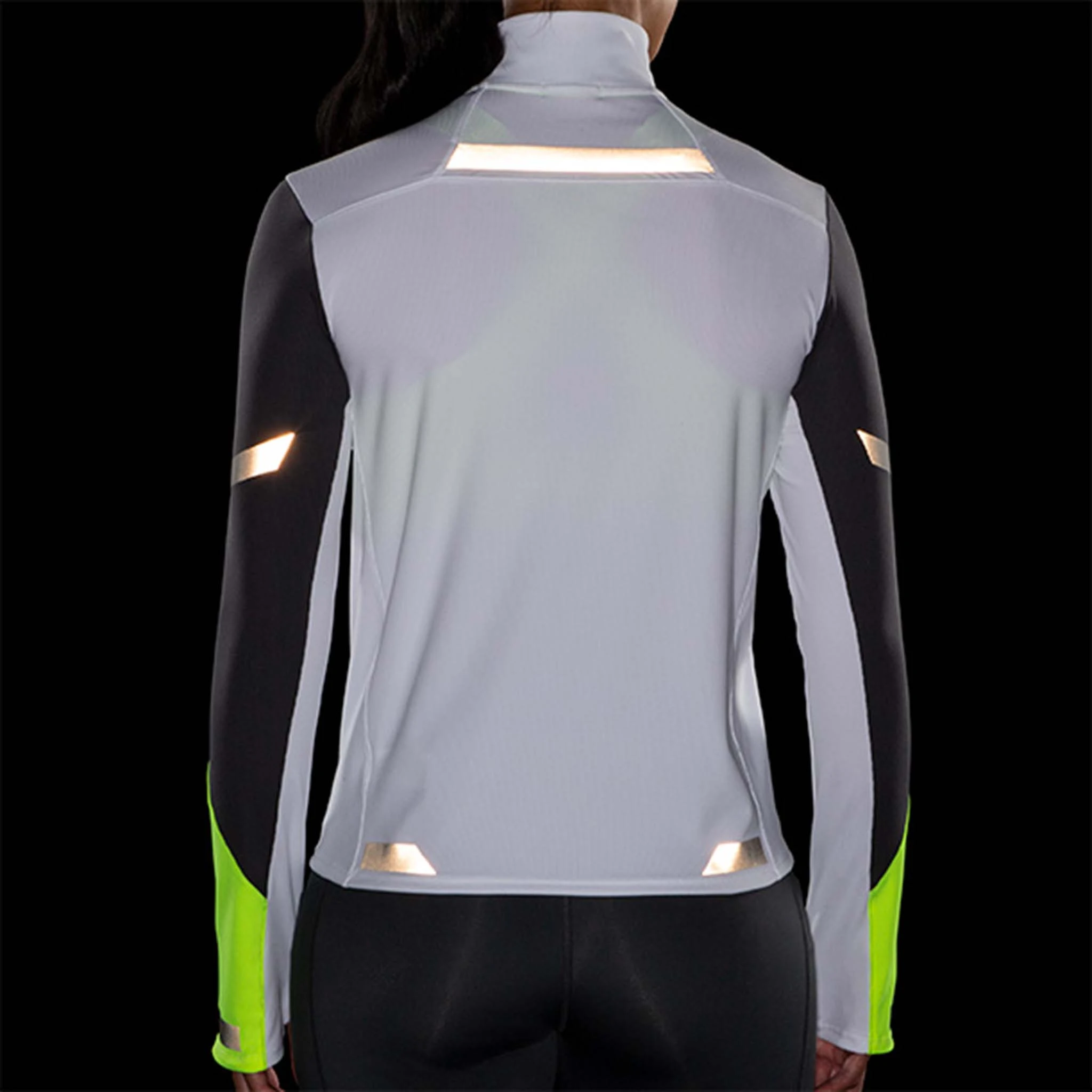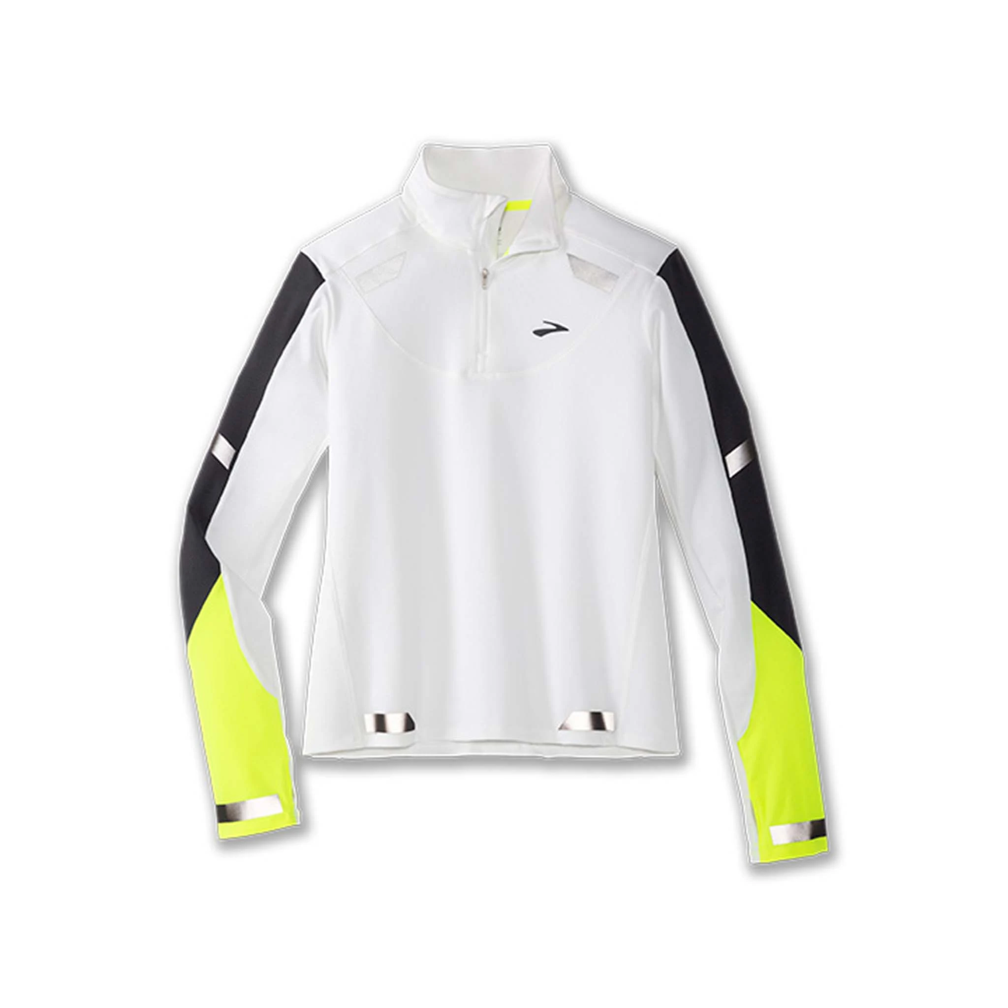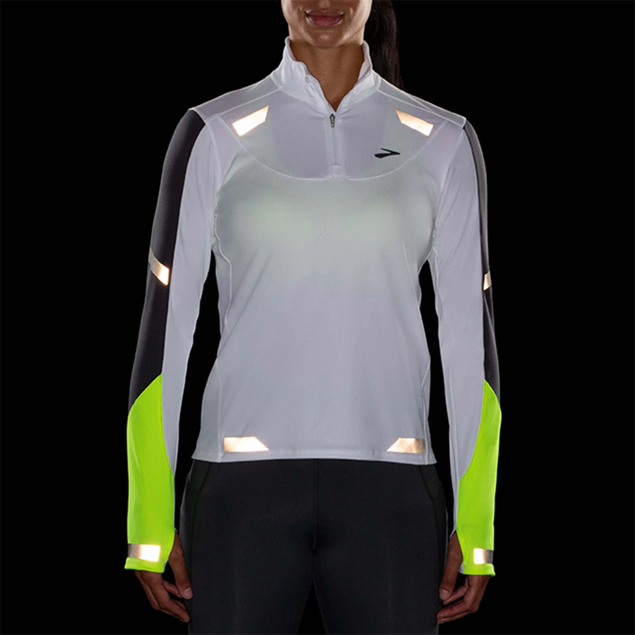 The Brooks Run Visible 1/2 Zip in the White/Asphalt/Nightlife colourway offers incredible levels of reflective visibility. Wind blocking fabric makes this long sleeve the perfect layering piece on cooler days. The inclusion of thumb loops adds extra protection for your hands and prevents sleeves from riding up.