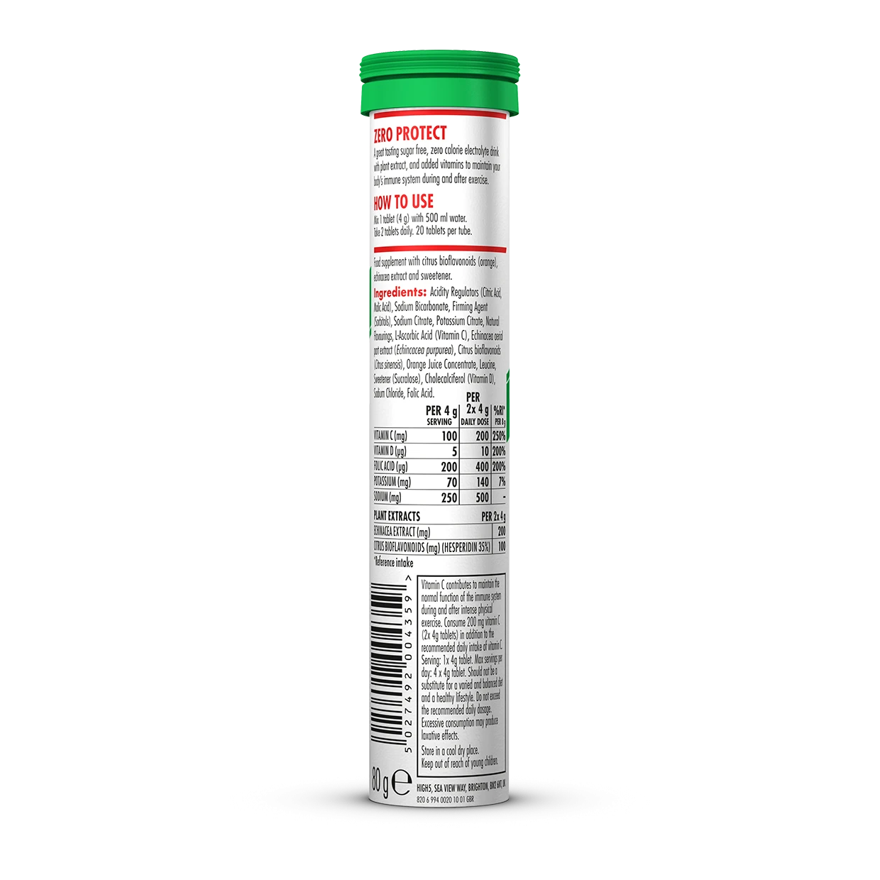 ZERO Protect is an advanced ZERO tablet that hydrates you while also maintaining your immune system during and after intense exercise. This great tasting zero calorie immune electrolyte drink can be used during exercise and throughout the day to rehydrate with vitamins, plant extracts and key electrolytes, including sodium and potassium.