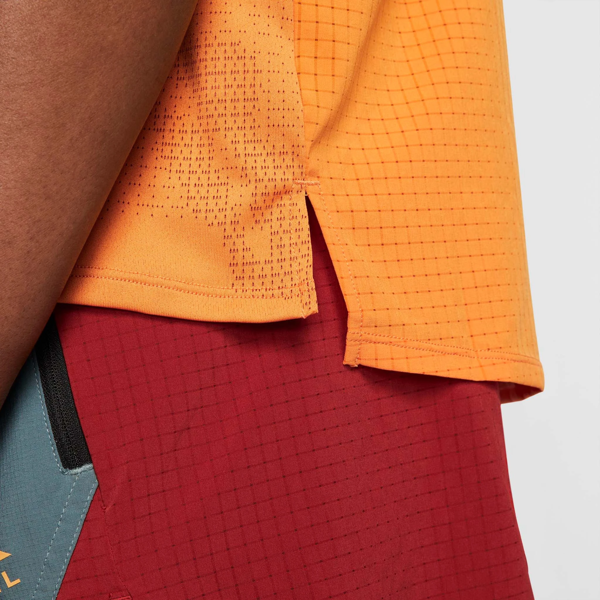 Nike used insight from trail runners to create the breathable design of the Dri-Fit Trail Rise 365 top in the Light Curry/Habanero Red colourway. Made from a light and smooth woven fabric, it uses Dri-FIT technology to help you stay dry and comfortable throughout your run. A stash pocket on back is perfect for storing your lightweight essentials, while Nike Breathe fabric helps to keep you cool and dry.