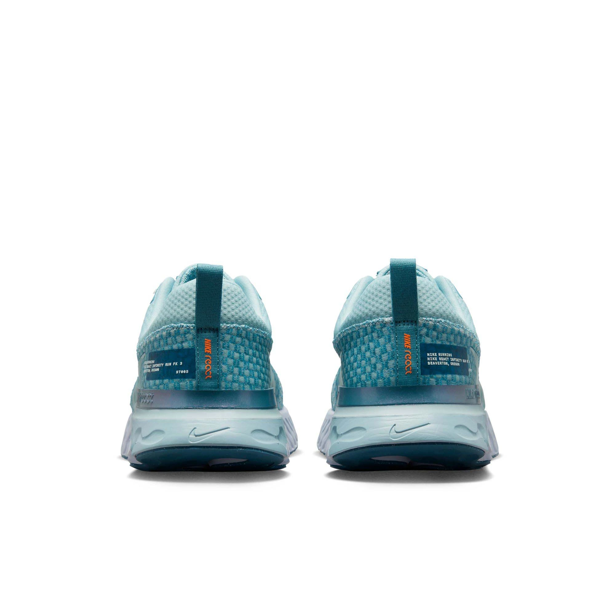 Advice for Road Runners: Still designed to keep runners running, the Nike Men’s React Infinity Run Flyknit 3 Running Shoes in the Ocean Bliss/Noise Aqua/Football Grey colourway reduce the stress of your daily runs and help speed recovery.