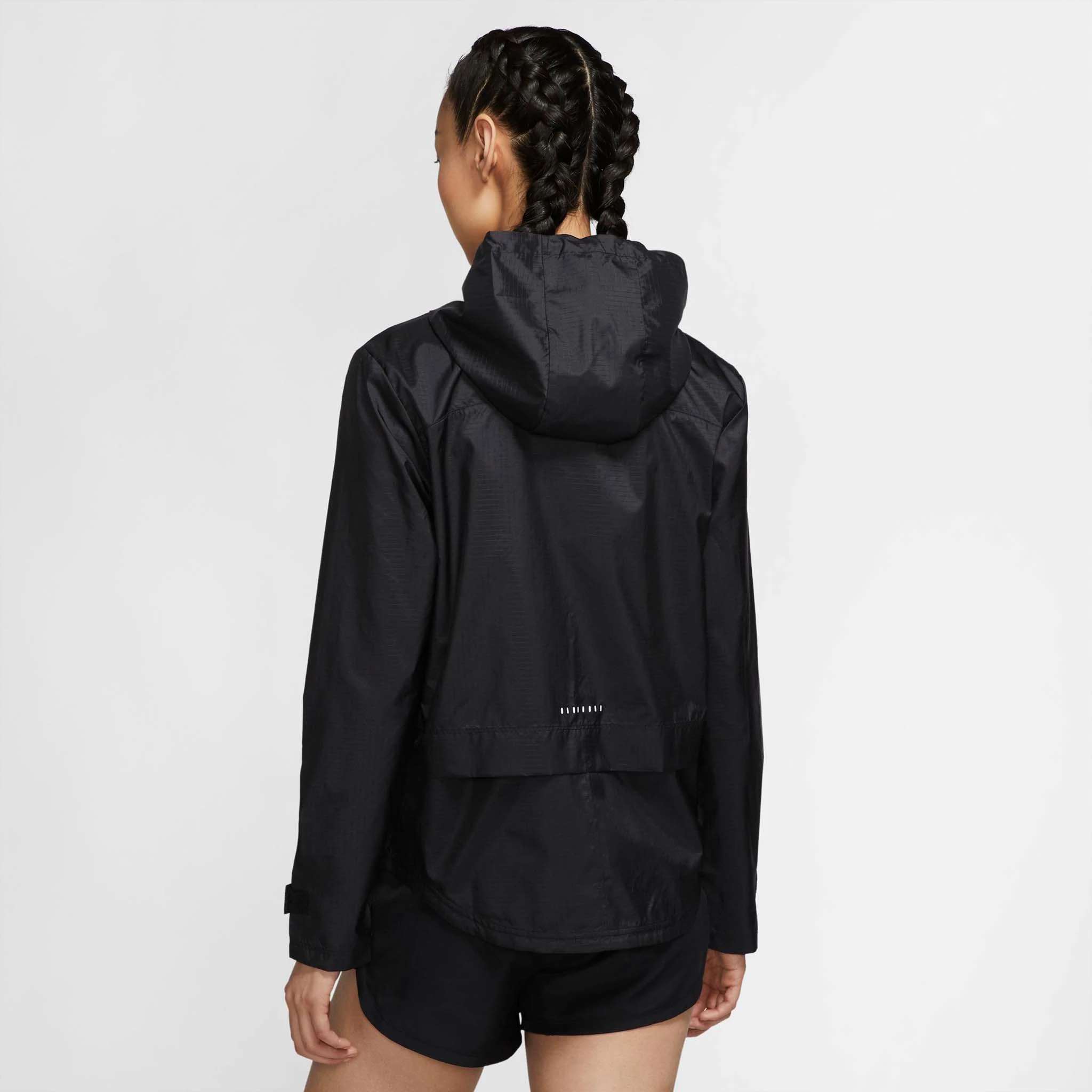 Be ready for showers with the new Nike Essential Jacket Plus in the Black/Reflective Silver colourway, specially woven water repellent fabric and an extended hood have got you covered.