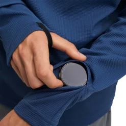 The Climate Shirt by On Running in the Denim colourway is designed to withstand the cold. Built in thumb and watch holes mean you can maintain full coverage at all times and still check your stats.