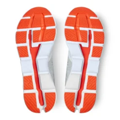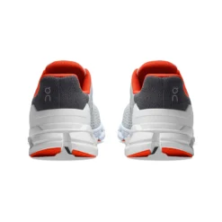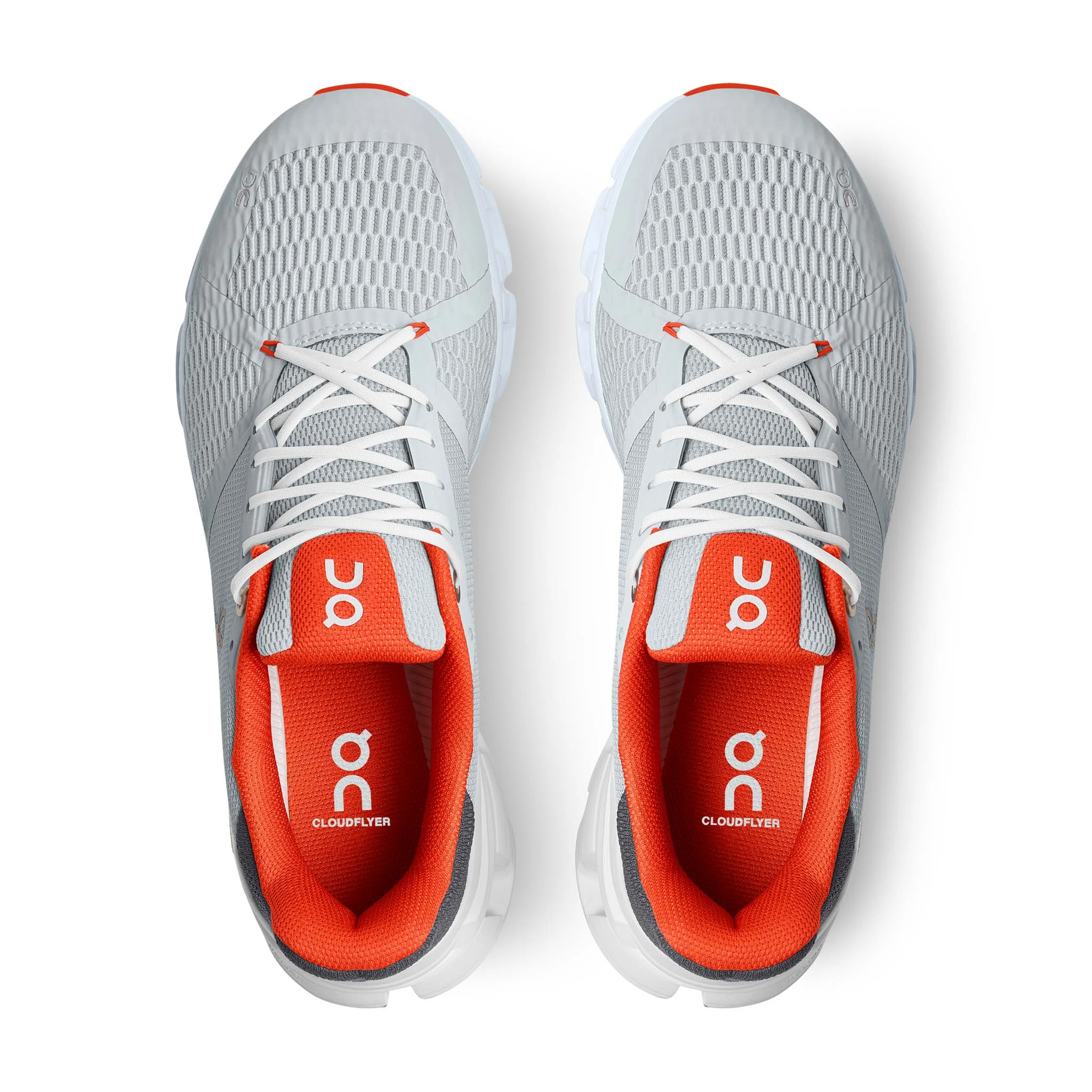 Advice for Road Runners: The Cloudflyer from On Running in the Glacier/Flame colourway delivers stability and control to your runs in a lightweight and non-intrusive manner. Helion superfoam makes up the full midsole of the shoe. This provides lots of cushioning plus energy return and will feel softer than the previous model. The heel base and cloud cushioning is also wider for more stability. Despite this being well cushioned, the Speedboard delivers a snappy feel. It will therefore feel good while picking up the pace.