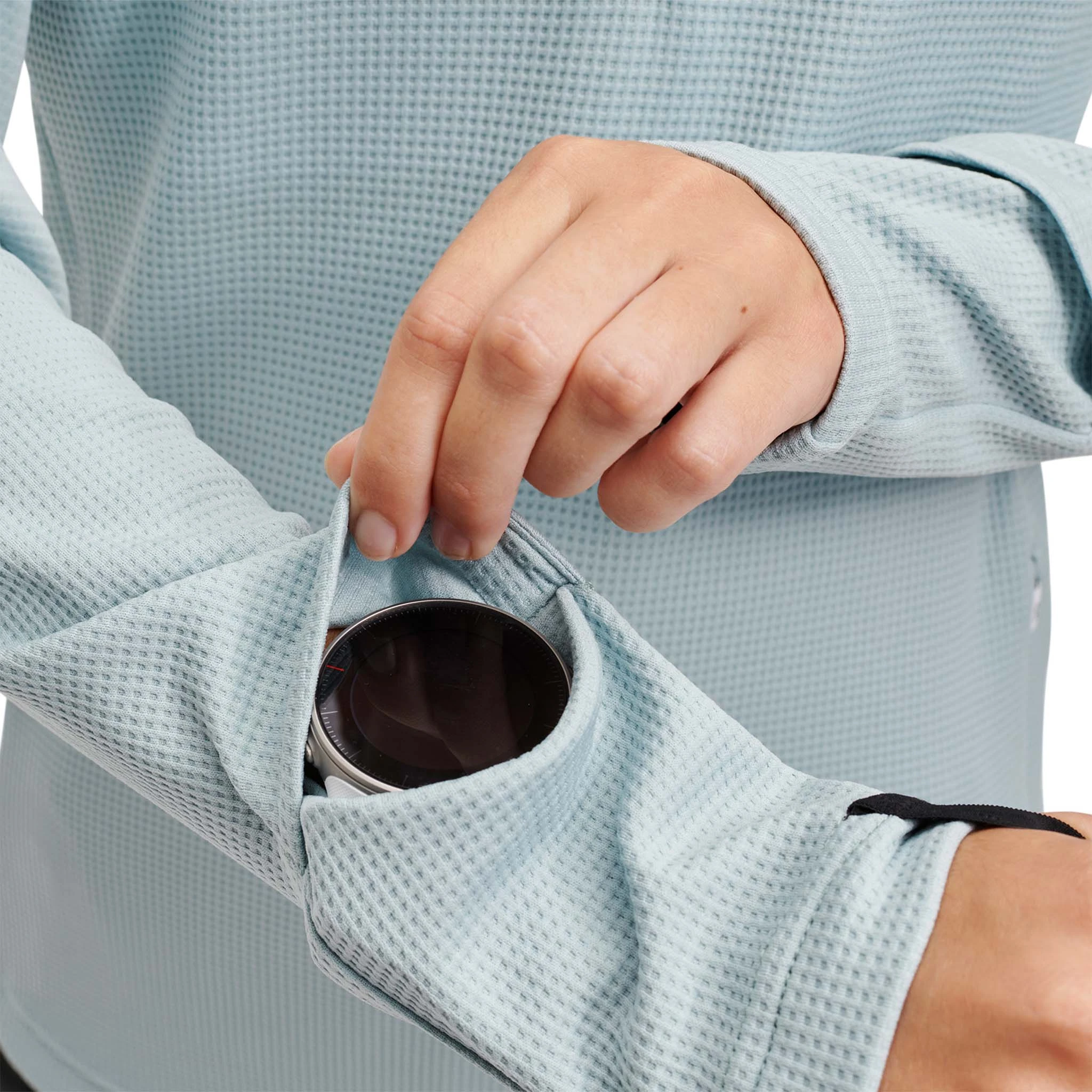 The Climate Shirt by On Running in the Sea colourway is designed to withstand the cold. Built in thumb and watch holes mean you can maintain full coverage at all times and still check your stats.