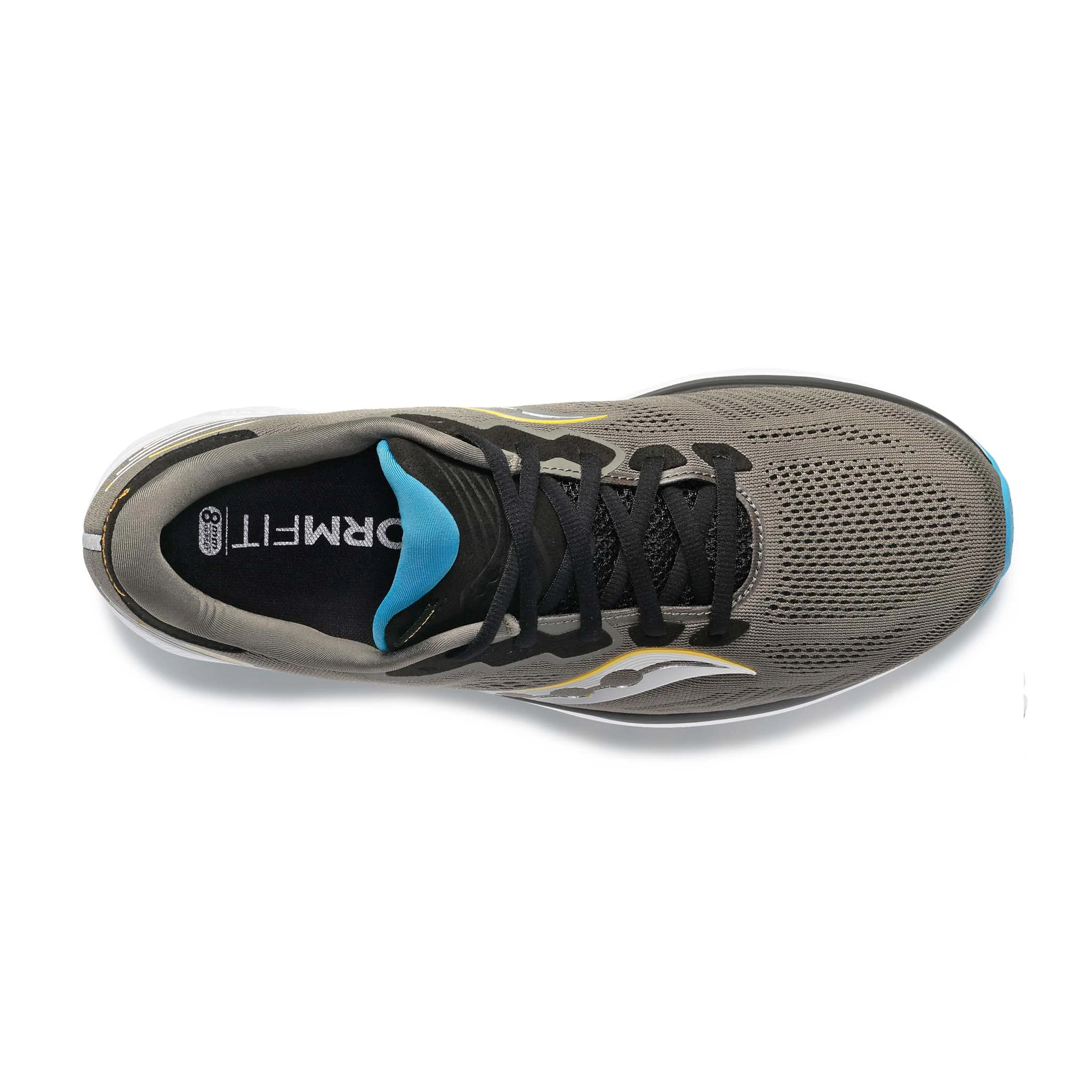 Advice for Road Runners: The Saucony Ride 14 in the Rockface/Topaz colourway is a supportive neutral shoe that delivers excellent cushioning and energy return. The shoe now features a sleek upper with sock-like FORMFIT construction and breathable engineered mesh with 3D printed overlays. The heel collar and tongue have also been updated from the Ride 13, with less bulk to improve the fit. The design of the upper helps accommodate a variety of foot shapes. A perforated mesh reduces weight and enhances breathability.